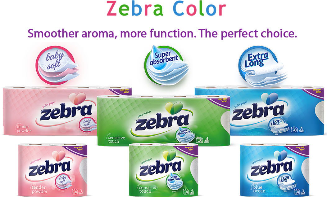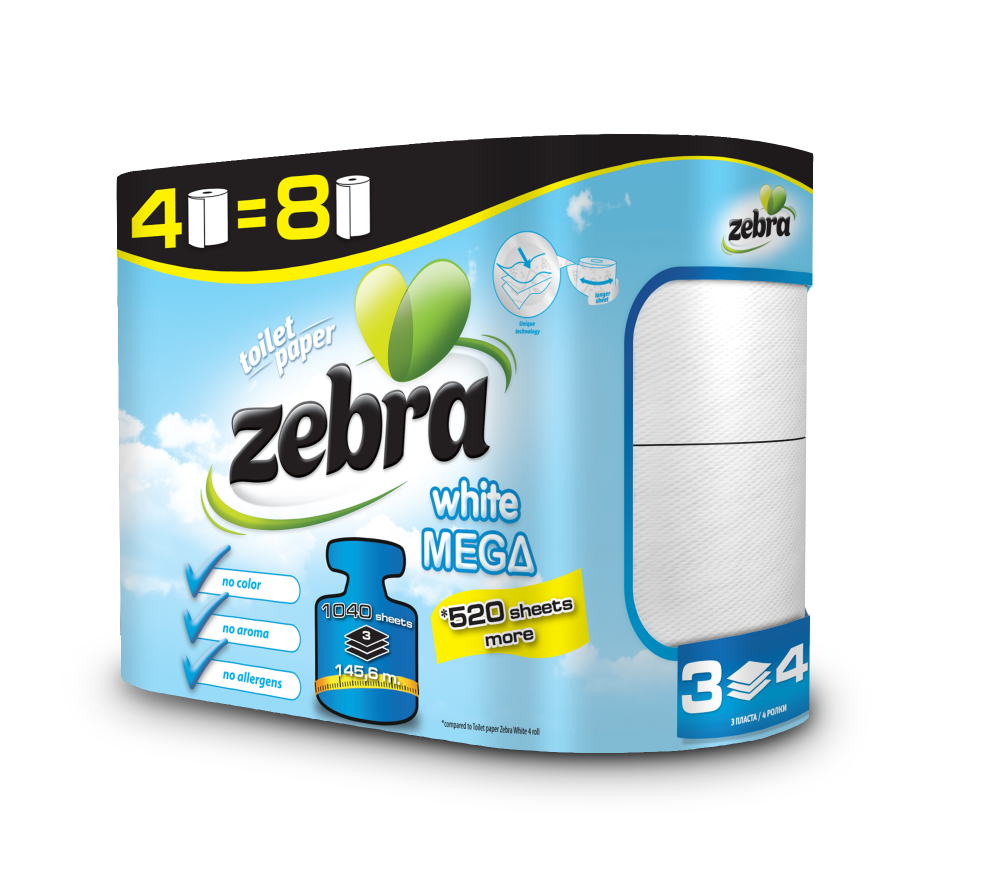 The ZEBRA White toilet paper is the first cellulose paper produced in Bulgaria with a longer, thicker and highly absorbent top layer, dermatologically tested - No colour; No aroma; No Allergens.